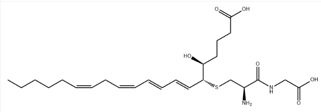Glycine, S-[(1R,2E,4E,6Z,9Z)-1-[(1S)-4-carboxy-1-hydroxybutyl]-2,4,6,9-pentadecatetraen-1-yl]-L-cysteinyl-; Glycine, N-[S-[1-(4-carboxy-1-hydroxybutyl)-2,4,6,9-pentadecatetraenyl]-L-cysteinyl]-, [R-[R*,S*-(E,E,Z,Z)]]-; Glycine, S-[(1R,2E,4E,6Z,9Z)-1-[(1S)-4-carboxy-1-hydroxybutyl]-2,4,6,9-pentadecatetraenyl]-L-cysteinyl-; S-[(1R,2E,4E,6Z,9Z)-1-[(1S)-4-Carboxy-1-hydroxybutyl]-2,4,6,9-pentadecatetraen-1-yl]-L-cysteinylglycine; Leukotriene D; LTD4 |